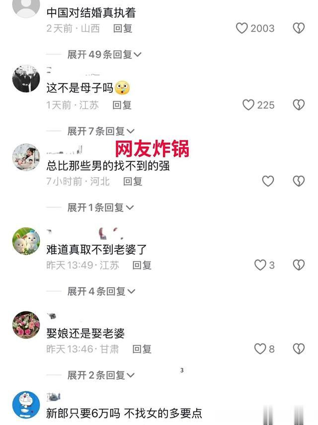 还有人感慨:“这到底是娶娘,还是娶新娘,这种婚姻能幸福吗?要我说,应该是新娘给新郎彩礼,再给几万精神损失费。”