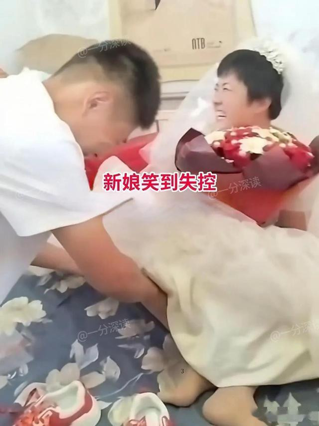 随后,小伙要给新娘穿鞋。新娘不好意思,脚丫子往裙子里缩。小伙没办法,就把手伸进去找脚。新娘发痒,笑到失控,这才有点喜庆氛围。