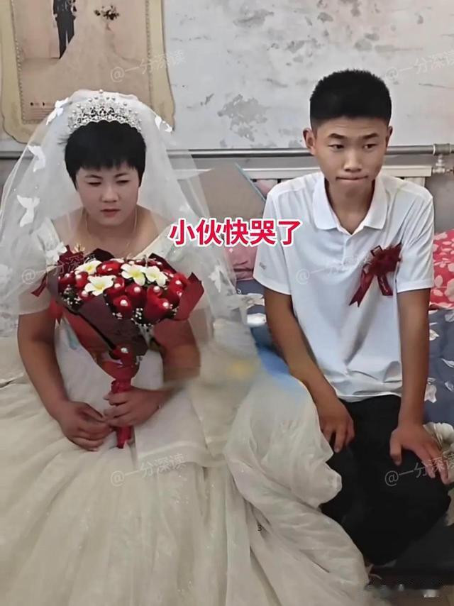 小伙留着寸头,穿着体恤和长裤,长得很朝气,却一脸不情愿。他瘪着嘴,左右观望。看看他身边的新娘,就不难理解了。